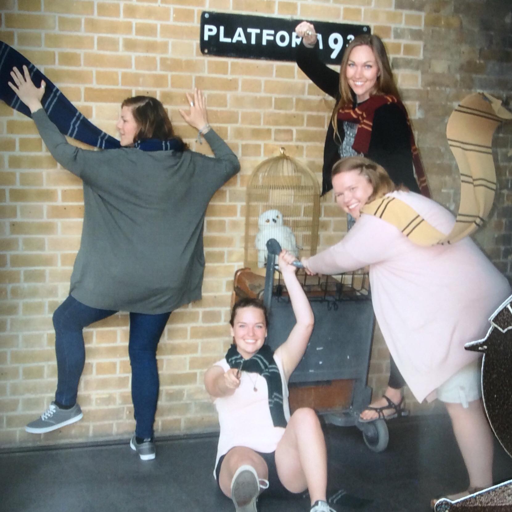Harry Potter fans realize the significance of this popular station as where young witches and wizards board the Hogwarts Express to school. Fans can also take pictures at platform 9 ¾. On my first visit in 2010, the “Harry Potter” platform was in between platforms 10 and 11 and you would jump up to the cart as soon as someone walks away (there are tracks between 9 and 10), but King’s Cross has moved Platform 9 ¾ to the lobby area, and there are ropes set up to create a line with a professional photographer and gift shop. We asked the people behind us in line to take our photo, but, in the end, the professional photographer was much better, so I splurged on the photo. When you enter King’s Cross, there is a map and Platform 9 ¾ is clearly marker on the map.